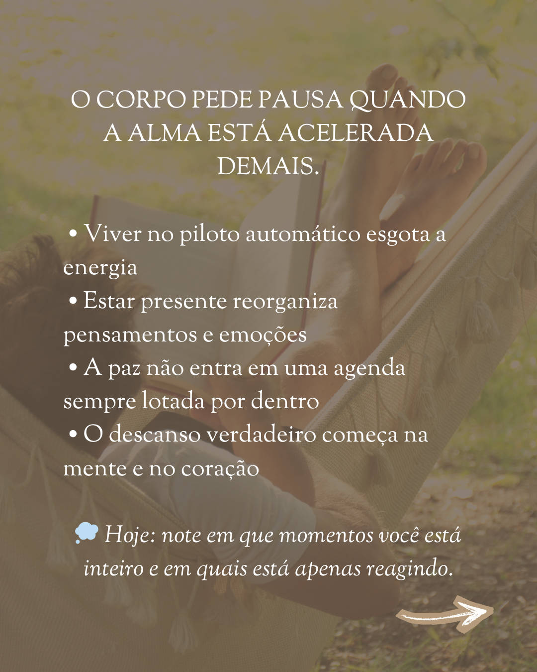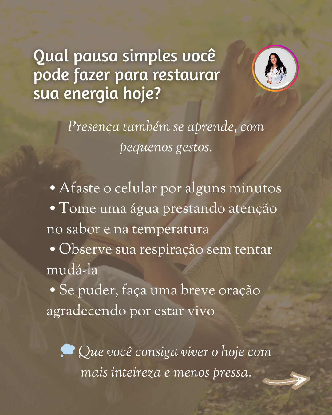 Permitir-se estar presente é um ato de autocuidado. É nesse espaço que a energia se reorganiza, o corpo descansa e a mente encontra clareza para seguir com mais equilíbrio.