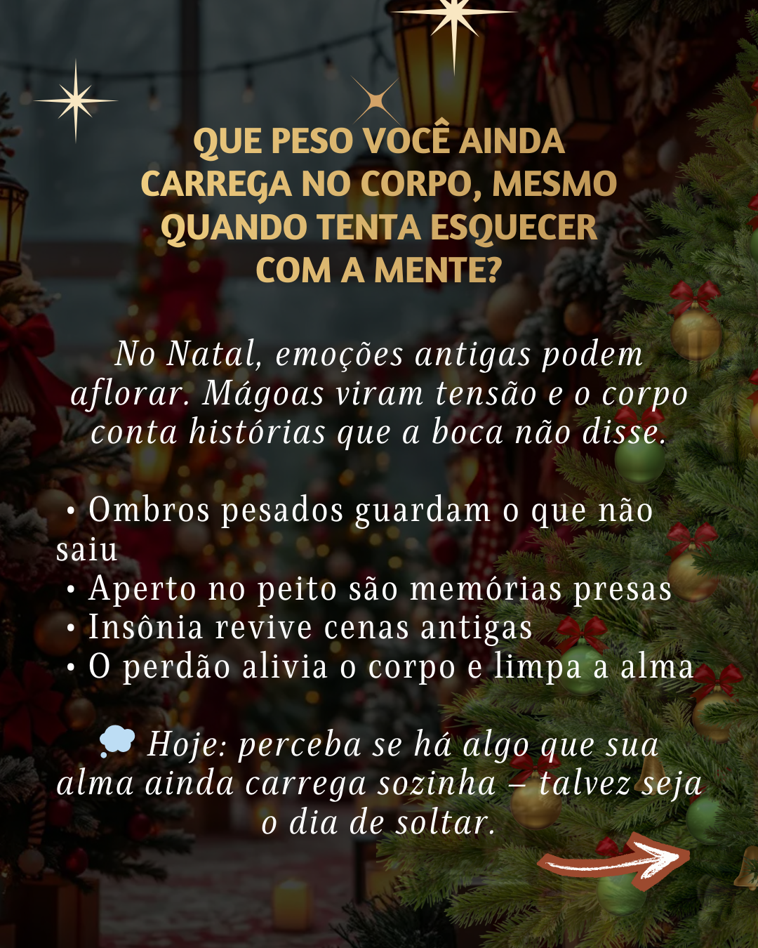 O Natal é um tempo que desperta lembranças profundas. Nem todas são leves. Muitas vezes, emoções antigas retornam silenciosamente e o corpo passa a carregar aquilo que a mente tentou deixar para trás. Mágoas não resolvidas se transformam em tensão, cansaço e desconforto físico.