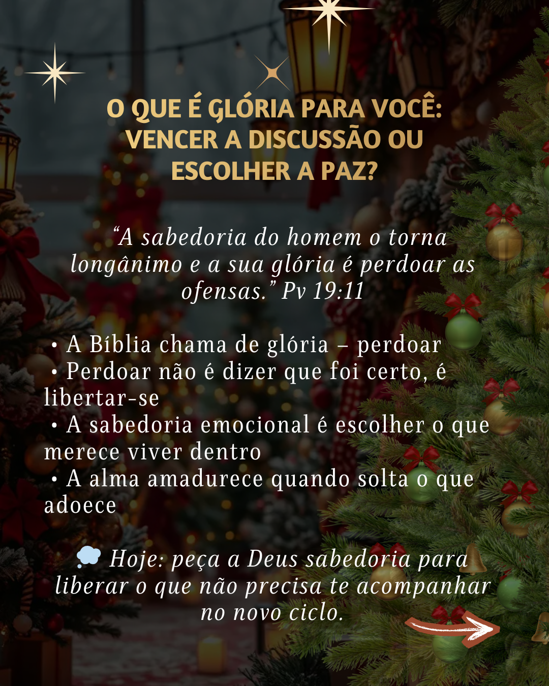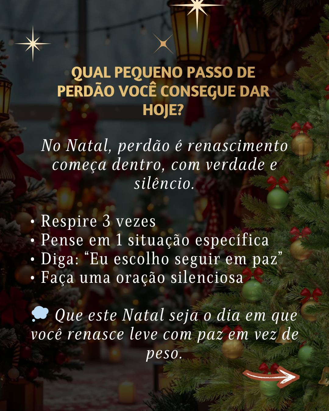 Que este Natal seja também um recomeço emocional. Um dia em que você escolhe a leveza no lugar do peso, a paz no lugar da repetição da dor, e o descanso no lugar do conflito interior. Angela Dias